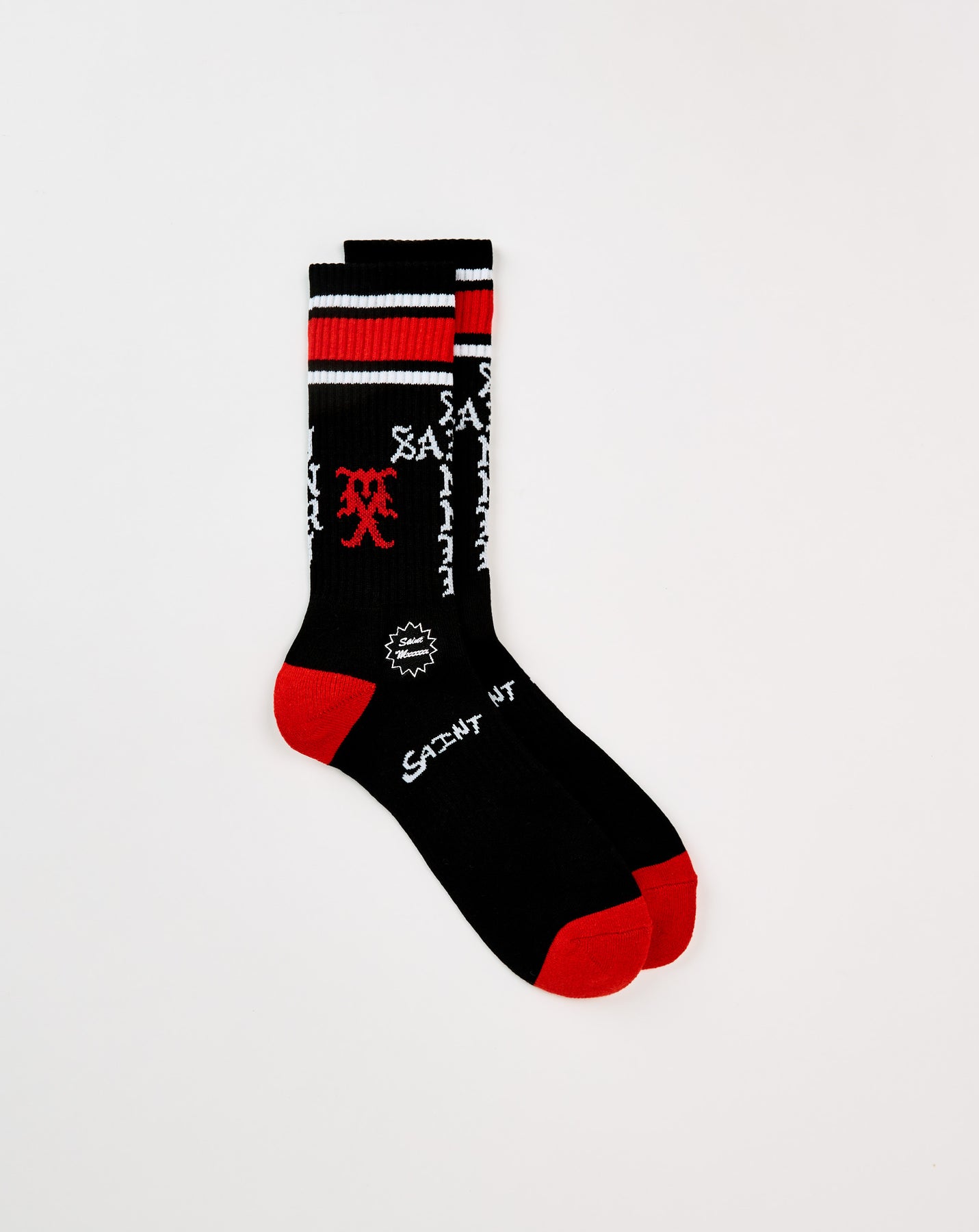 The SAINT Mxxxxxx Sinner Socks feature jacquard graphics and bold stripe detailing for a sharp streetwear finish. The cushioned pile knit and calf-length design keep comfort locked in all day.