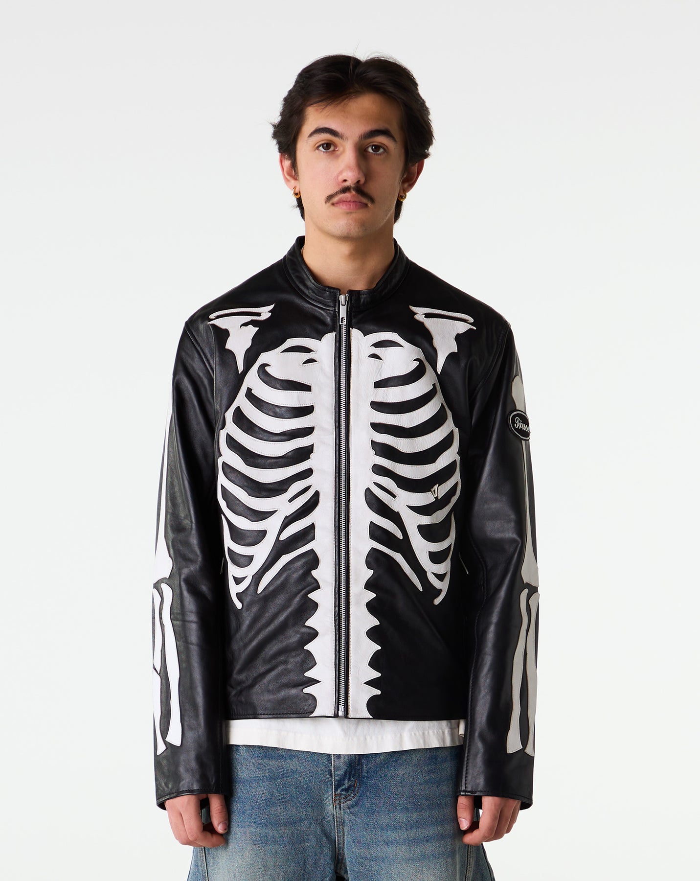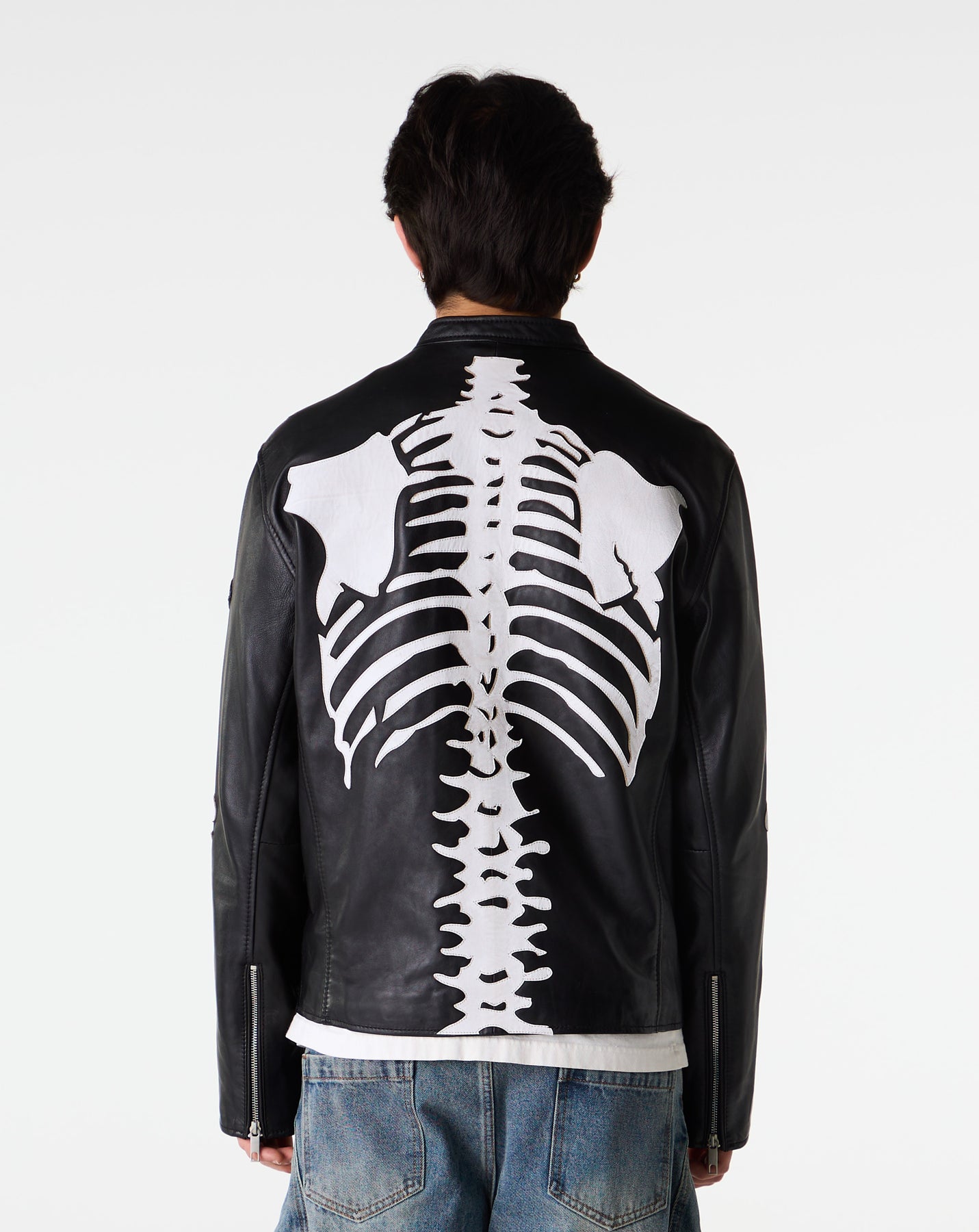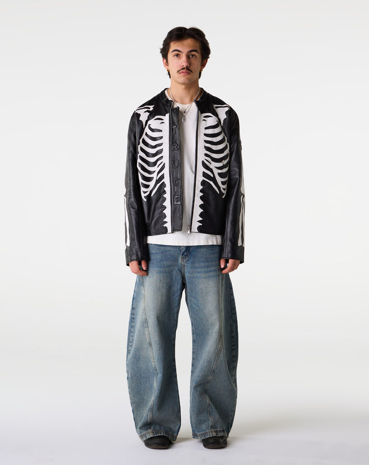 The Truce Skeleton Leather Jacket makes an instant visual impact with its wraparound skeleton design. The relaxed fit and premium leather create a polished yet bold everyday option.