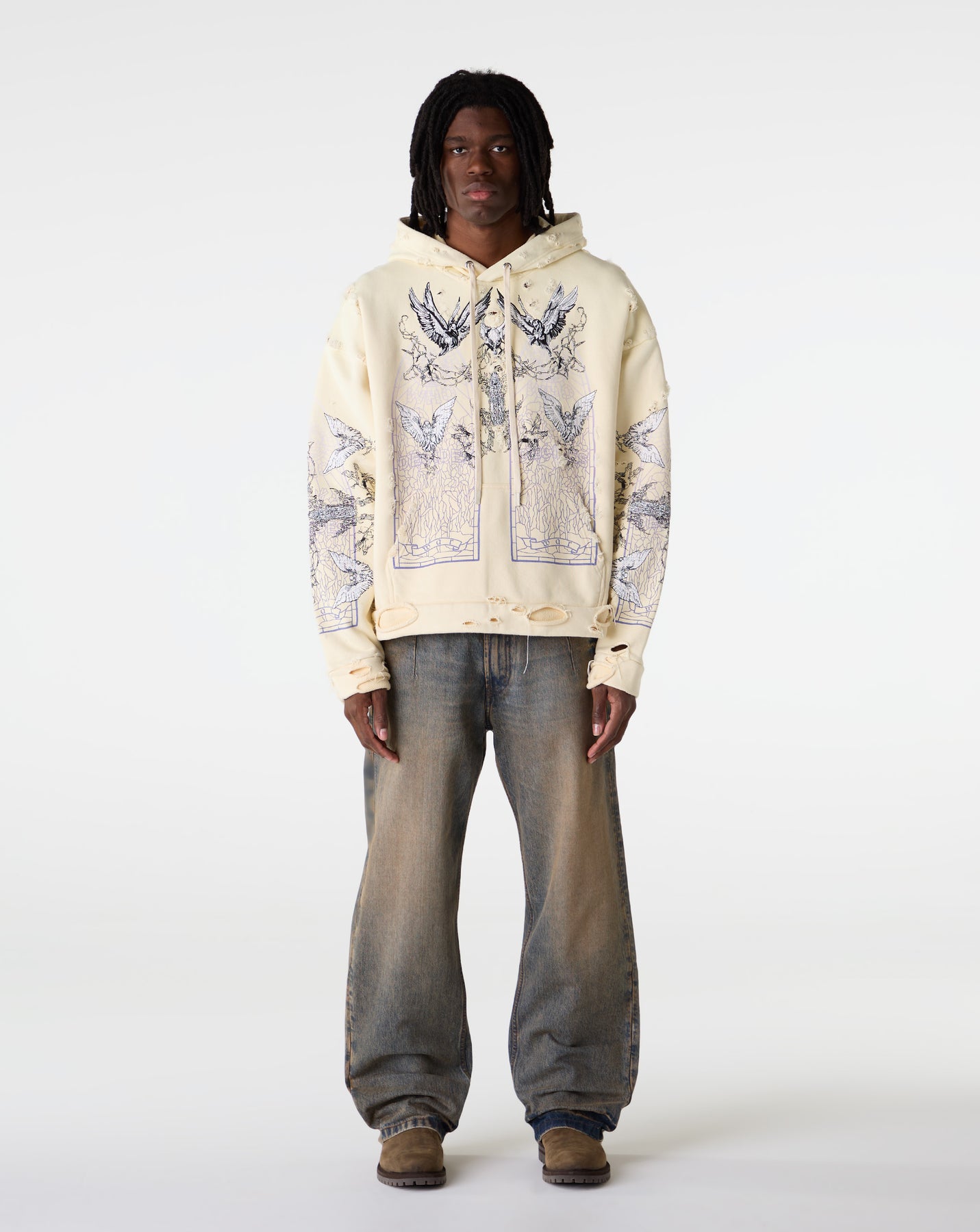 The Who Decides War Ascension Hoodie stands out with distressed details and all-over printed graphics. Made from premium cotton, this hoodie brings a relaxed streetwear silhouette with raw character.