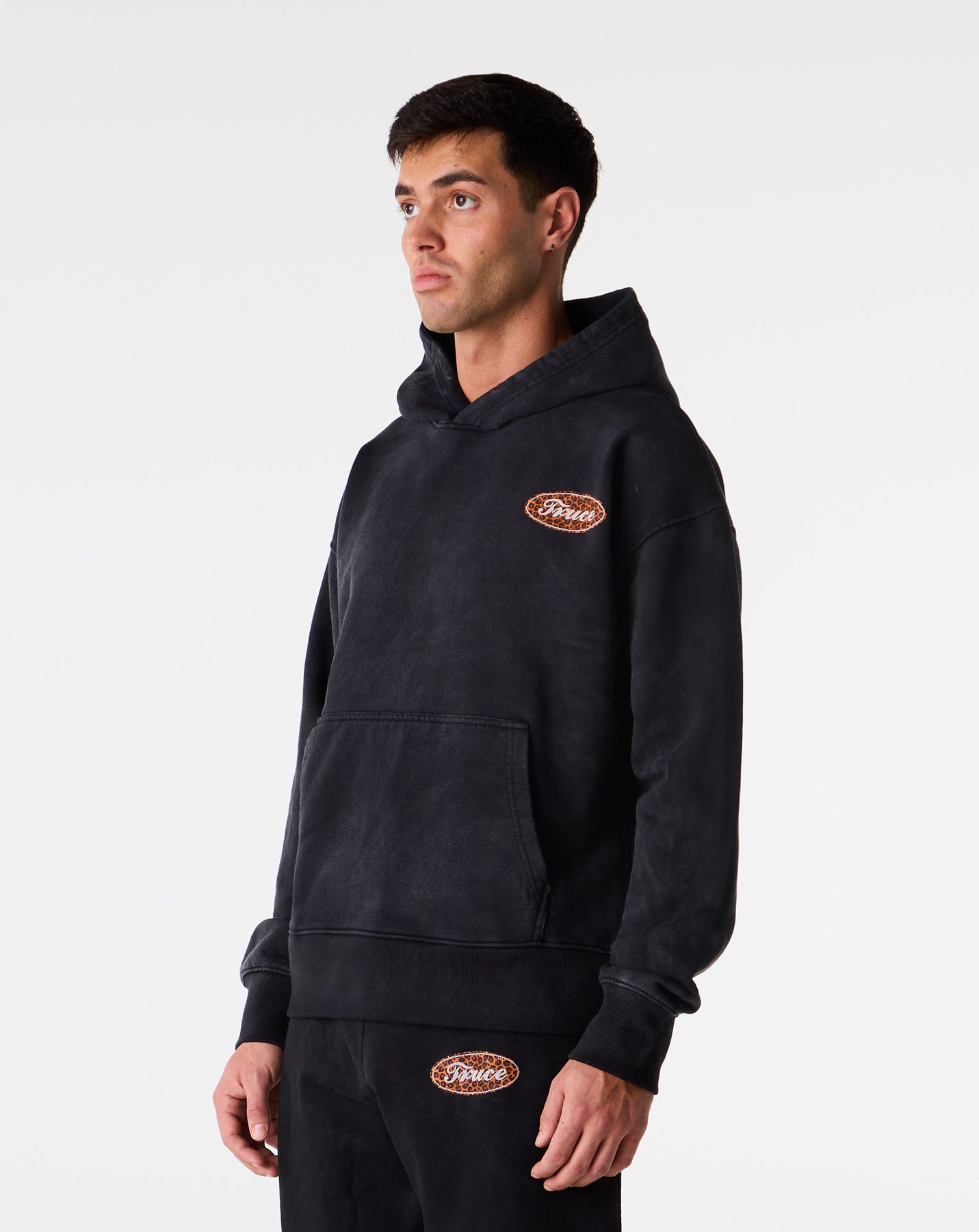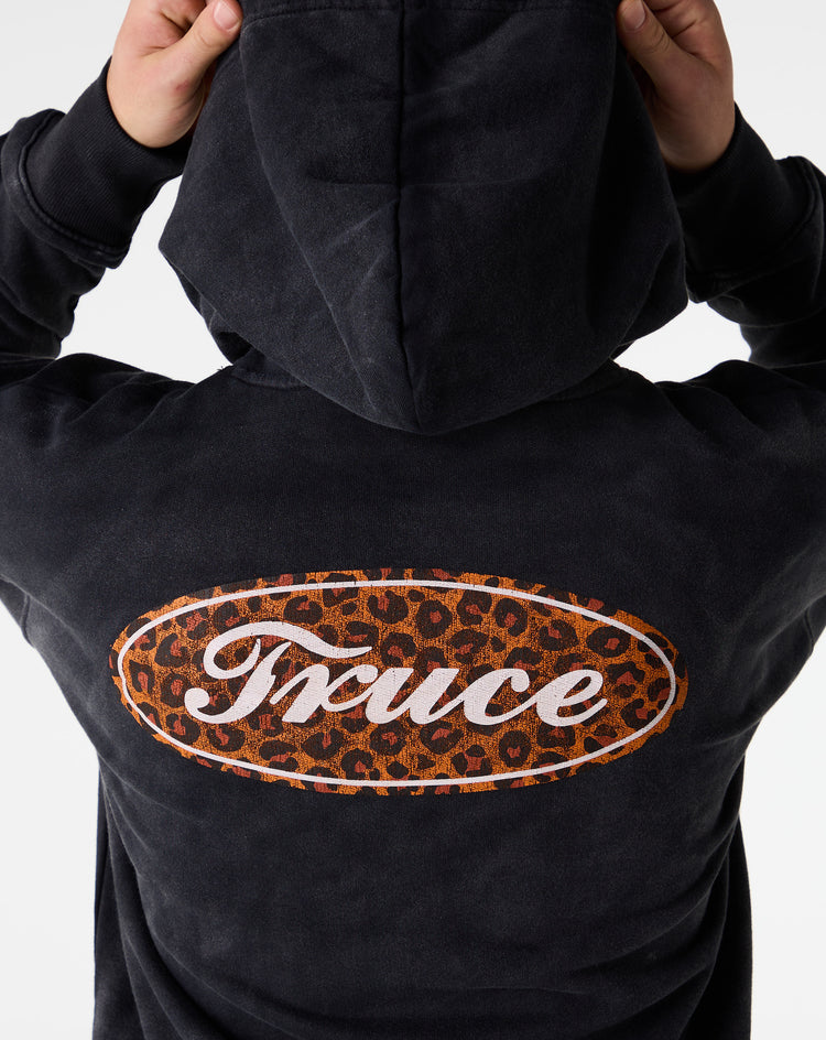 The TRUCE Repair Leopard Hoodie features a bold leopard print with logo hits on the chest and back, plus a practical kangaroo pocket. Ribbed cuffs and hem reinforce the fit for lasting wear.