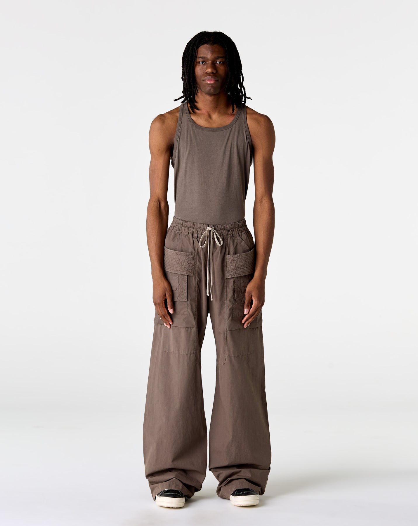 The Rick Owens DRKSHDW Creatch Wide Cargo Drawstring pants have a relaxed fit with an oversized waist drawstring and multiple cargo pockets. Made from cotton, these wide-leg pants offer a comfortable and stylish silhouette.