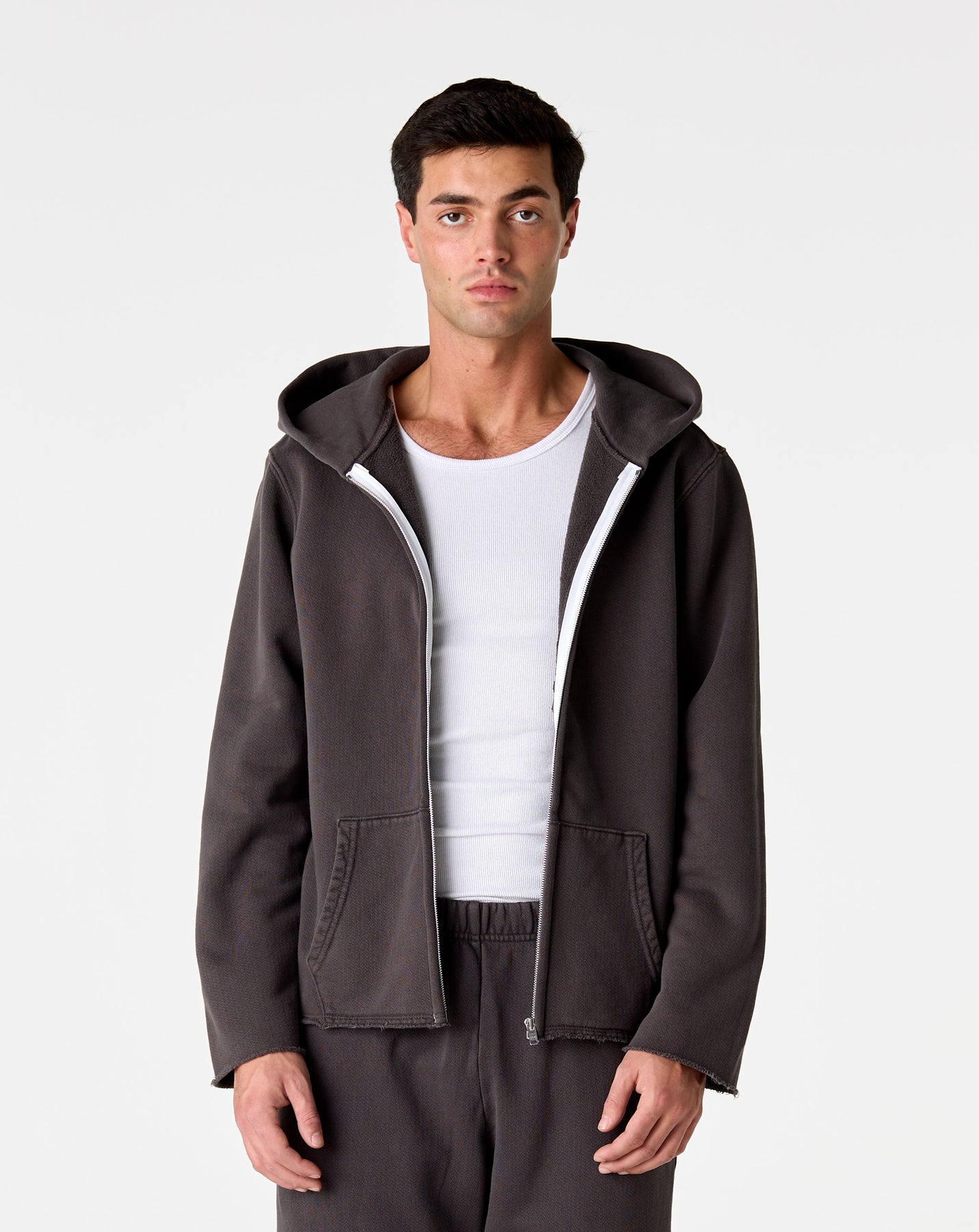 The Les Tien Raw Zip Hoodie stands out with a relaxed fit and raw-edged cuffs and hem. Crafted from cotton construction, it features a zip-up closure, classic hood, and kangaroo pockets for everyday wear.